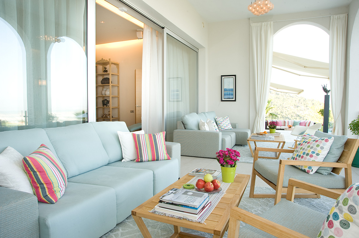 The exterior living areas of the home were the last to be tackled and the businesswoman turned to interior designer Justine Knox (www.knoxdesign.net) to source new outdoor dining furniture, easy chairs, rugs and a modular sofa for the covered terrace. “My client had seen a sofa in a magazine and wanted something similar,” Justine says. “We found a modular arrangement from one of our Spanish manufacturers, Confort 2000, and she was able to try the Naron model in the showroom.” Designers Guild Tiana fabric was sent to the manufacturer, who made removable covers for each module. “The result is a very comfortable, practical and versatile sofa arrangement.” The new look was completed with easy chairs and low tables from the Gloster Axis range, dining tables from the Westminster Linea range (sourced from Knox Design), and cushions from La Oca. The project proves that indoor and outdoor furniture can be successfully combined.