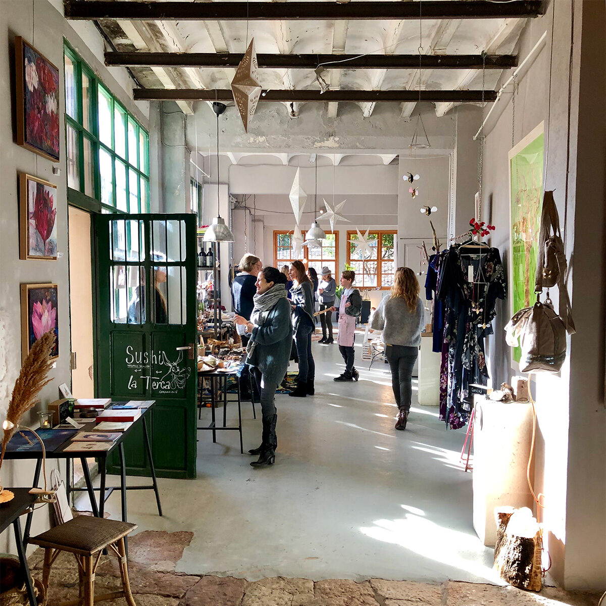 As time passed, the women noticed that their monthly gatherings were gaining in numbers. Word spread from Alaró to other villages until artists were venturing far and wide to join in the meeting. “Every time someone different arrived, they brought something new to the mix,” says Monica. They were always hands-on with local artists, happy to suggest new forms and techniques. Branches, lightings and wire were all examples of what Anja says, “were used to reflect the energy in the space. From one stall to another, we’d always find some unique way of presenting who each artist is.”
