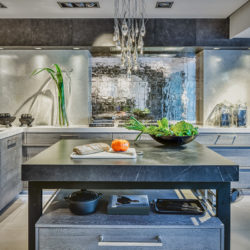 With a diverse range of materials, she creates modern kitchens which have become her trademark. In this she combines the materials so harmoniously that it seems as though only the textures vary: blackened oak and metal fronts, bronze glass tiles, granite worktops, solid wood and embossed leather unite to form a complete work of art.