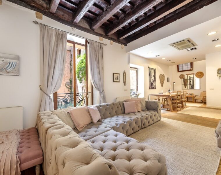 Character-filled duplex in Palma’s Old Town, featuring original beams, a fireplace, two bedrooms, and a refined blend of historic beauty and everyday comfort.