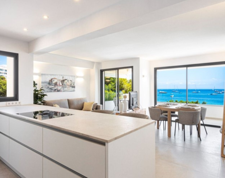 This first-line apartment in Santa Ponsa offers direct sea views, a private terrace, and modern interiors, ideal for Mediterranean living.