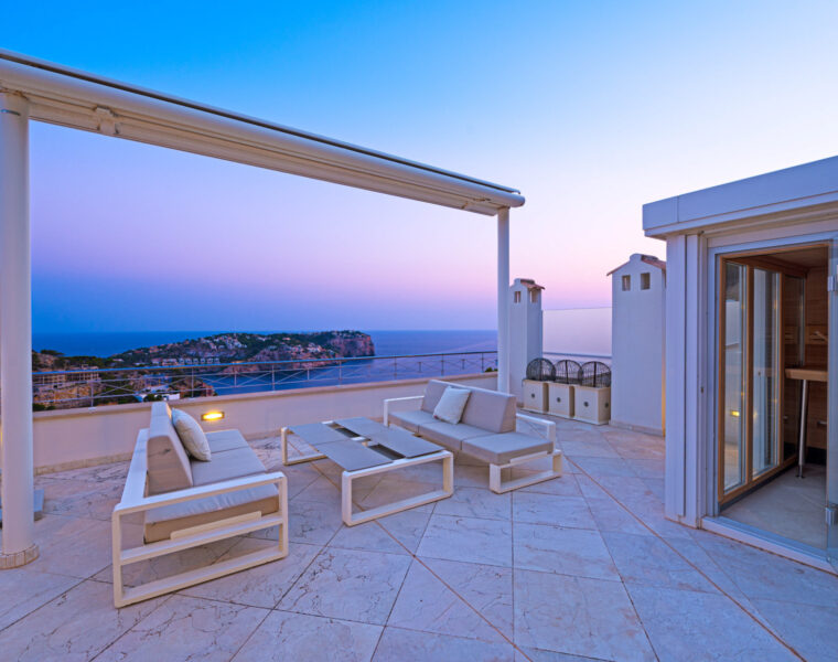 Elegant modern penthouse in Paguera near Port d’Andratx with panoramic sea views, private rooftop terrace with Jacuzzi, and access to an exclusive community pool.