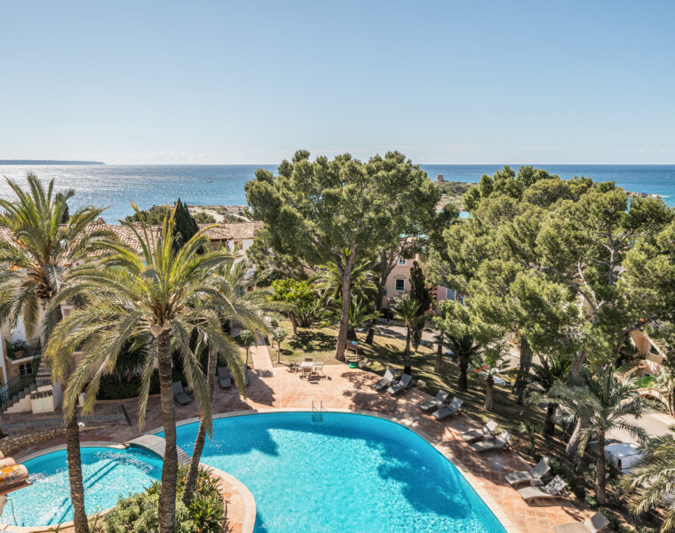 Elegant three-bedroom apartment with sea views, private terraces, and shared pool in Portixol, Mallorca.
