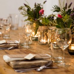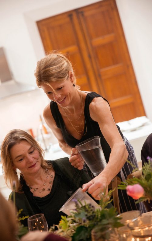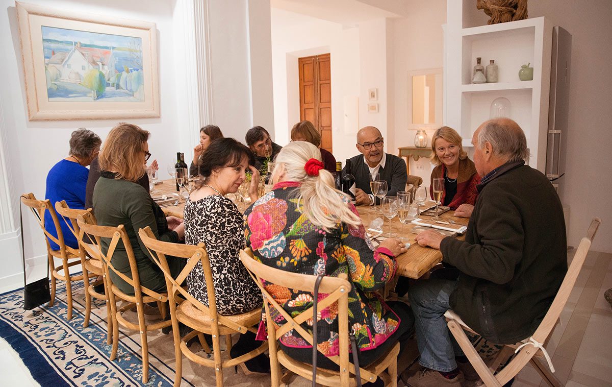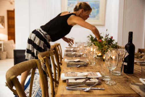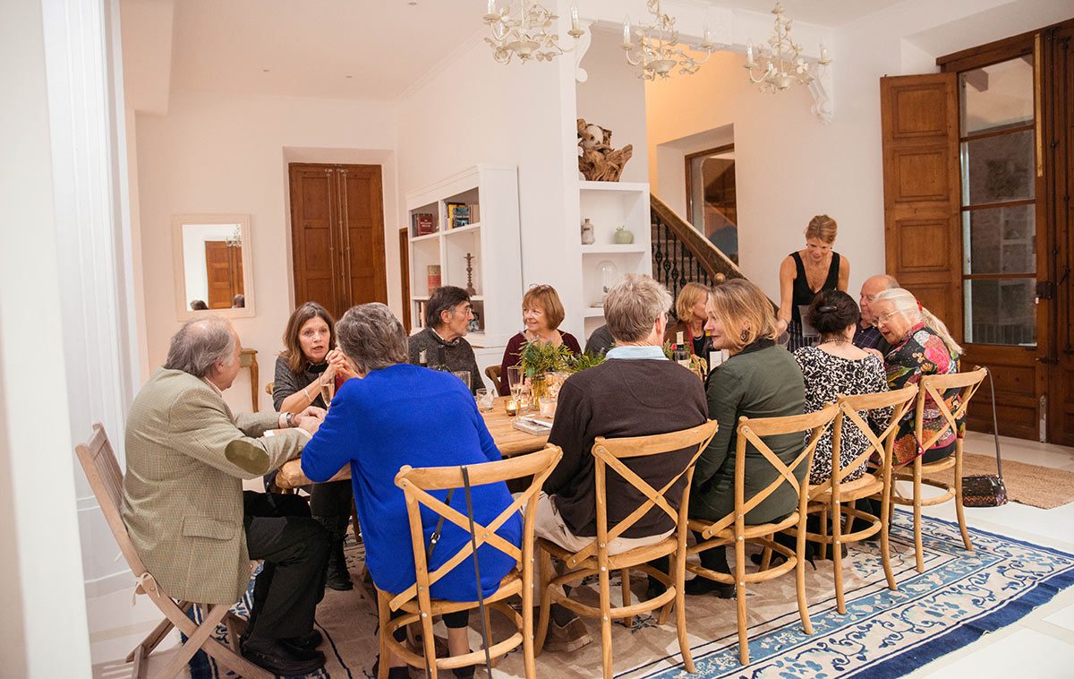 Twelve of us at Ca’n Ballester begin with a glass of cava and chance to meet each other, before taking our allocated places. The simple but elegant table decorations include tea lights and old Mallorcan floor tiles (discovered in a friend’s garden) as place mats.