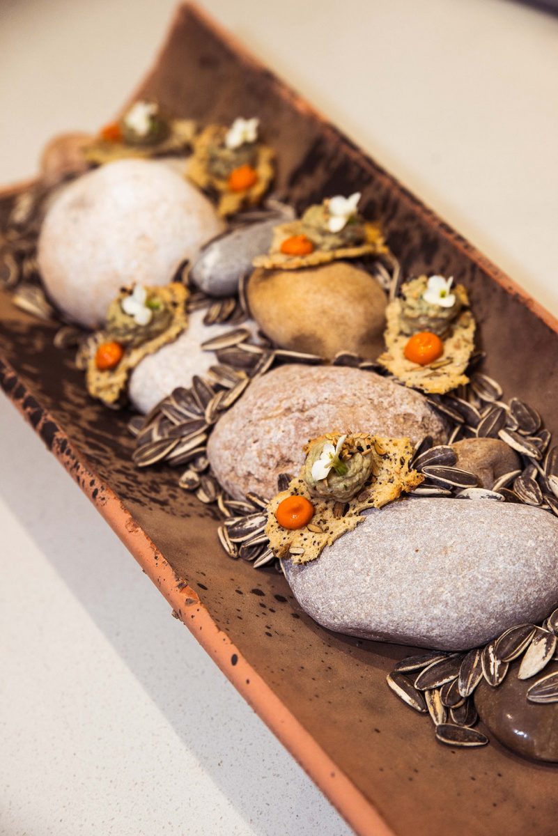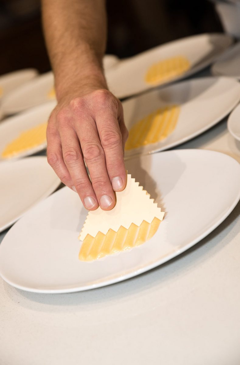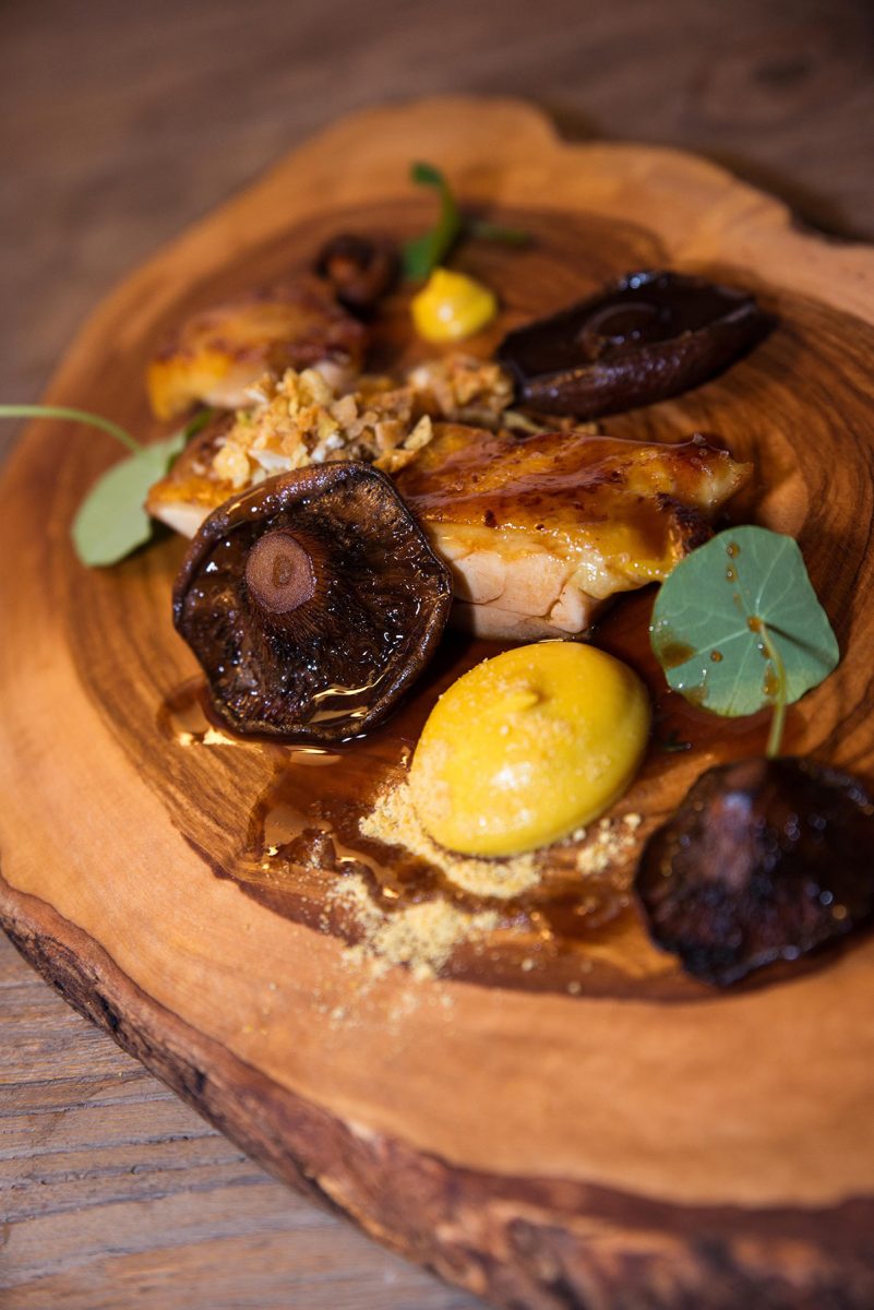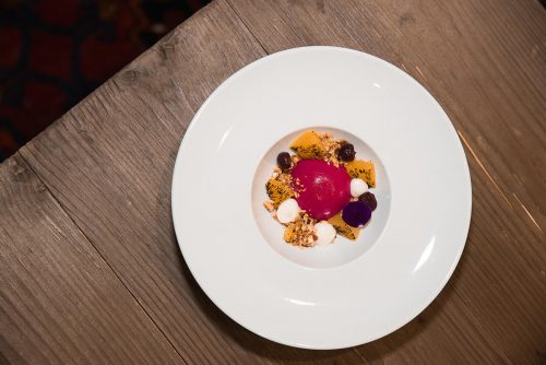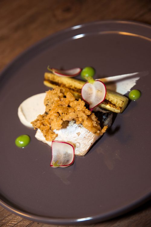 The printed menu reveals only the key ingredient of each of the eight dishes – which Piers explains fully on serving. We begin with two impressively presented successive appetisers: whipped aubergine on a seeded wafer (made from Piers’ own sourdough bread), then silky smoked salmon purée on crispy salmon skin with caper dust. In Australia, Piers had studied graphic design; his natural artistic and creative talents show in every delicious dish.