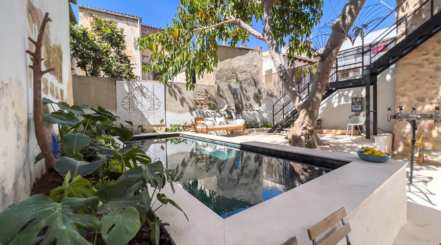 The top floor leads to a spacious rooftop terrace offering sweeping views over the terracotta rooftops of Felanitx — the perfect spot for quiet mornings or warm evening gatherings. The private patio, framed by traditional stone walls and a turquoise pool, brings a touch of calm to the centre of town. A garage with space for one car adds a practical touch to this charming historic home.