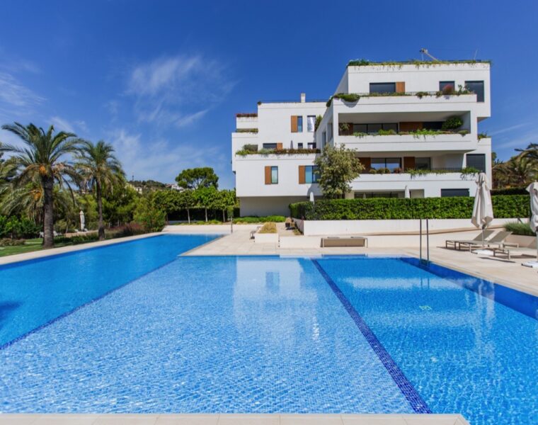 Exclusive brand-new 3-bedroom apartment for sale in Santa Ponsa with a private terrace and impressive outdoor community swimming pool, sauna and garden.