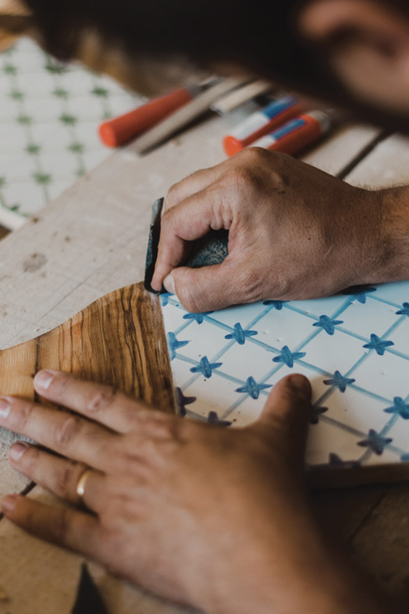 Naturally, Maria Antònia and Álvaro’s surroundings came to inspire the design of their new range. The couple created the wooden components. The colourful tiles, meanwhile, which are a particularly attractive feature of ConAlma’s range, are made in collaboration with a Mallorcan craftswoman. The tilemaker’s knowledge of ancient techniques complements Maria Antònia’s appreciation for contemporary aesthetics and Álvaro’s imaginative streak.
