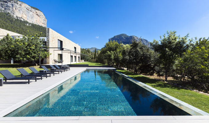 The majestic twin peaks of the Alaró mountains provide the backdrop to a magnificent cubist villa set in landscaped grounds, with an elegant pool area. Grandiosity, however, its owners and their chosen experts did not want; instead going for a wonderfully light-hearted ambience, with industrial and ethnic elements.