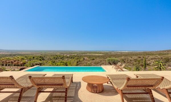 This newly built finca in Santa María offers stunning panoramic views, a private pool, and beautifully landscaped gardens, creating the perfect countryside retreat in Mallorca.
