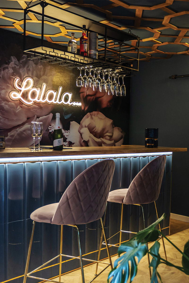 Adding to the boutique hotel feel, each of the five bedrooms has its own en-suite bathroom, plus there’s a fully functioning bar and games, perfect for entertaining. Neon lighting, gold latticework ceiling and big floral wallpaper really take this funkiest of spaces to the next level.