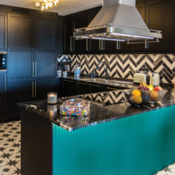 Smart black-and-white patterning is a consistent theme throughout most of the apartment, but with variations to distinguish between spaces; green crocodile-textured wallpaper in one, funky floral art deco in another. Blocks of turquoise panelling chime with the pink of the custom-built sofa. The property’s original sixties-era stained-glass doors were repurposed to make walk-in closets. Lighting was also designed to be a bit “sexier than a regular home” Cristina explains.