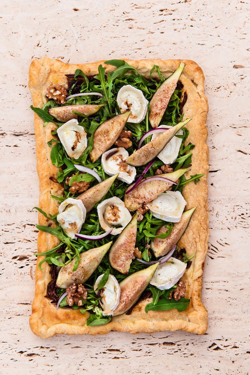 When it has cooled slightly, begin to assemble. Scatter generously with rocket leaves, Arrange the figs and goats cheese on top and scatter over some chopped, toasted walnuts. Drizzle with balsamic vinegar and olive oil and serve.