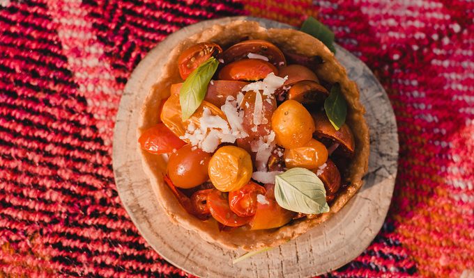 Unroll the puff pastry and place on a parchment lined baking tray. Fold over the edges to create an outer crust when baking. Brush the crust with eggwash and place in the oven to par bake.
