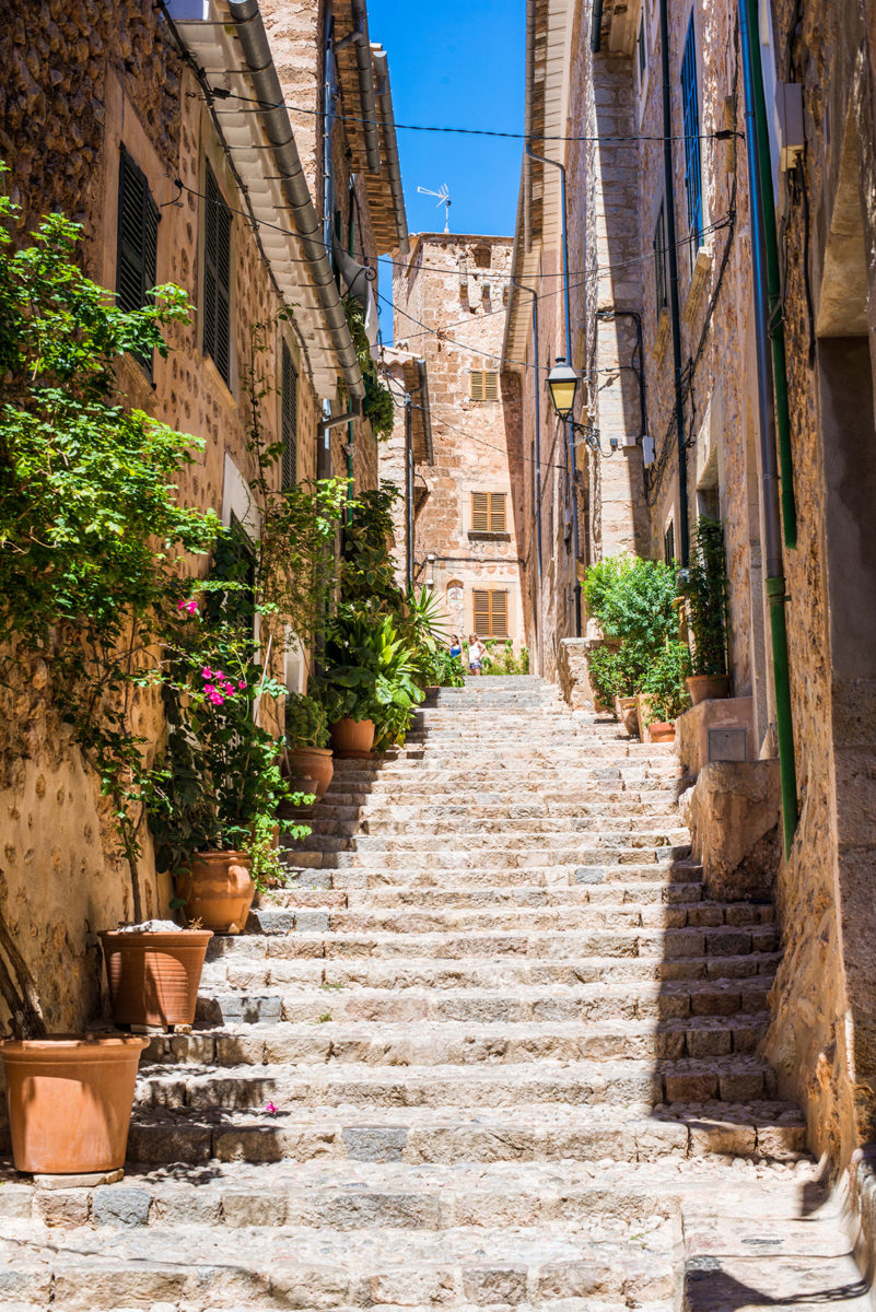 The centre of Fornalutx is dominated by pretty, centuries old Majorcan stone townhouses sat on the ancient steps and narrow cobbled lanes. Original features such as traditional green shutters and beautiful old carved wooden doors, and plant pots filled with pretty blooms are an iconic look of homes in this village.