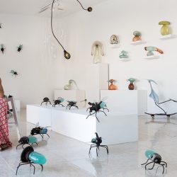The artist loves to transform everyday things into unique pieces. If not it would feel like a pointless repetition of the same to her. In the studio there are oil bottles with lids that are bigger than the bottles themselves – a reversal of meaning. Oil containers which were not sold, Raquel melted again and created a new installation: nine long-stretched bubbles are hanging from the ceiling like a huge mobile. Underneath crawls a colony of ants and beetles. With their shiny, turquoise and crystal bodies, and heads made from old bed springs, the little beasts look really amusing.
