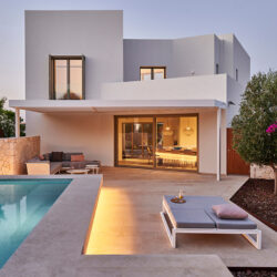 This urban villa in Portopetro, located in the southeast of the island, elegantly nestles into the gently sloping terrain, showcasing a modern Mediterranean aesthetic. Timeless and clear, the architecture by GLW Architects & Designers finds connections to traditional elements of Mallorcan building culture in its many details, such as the persianas and hand-hewn stone walls.