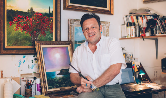 The second space is smaller, more intimate and isolated, the air imbued with an palpable buzz of creativity. Just finished and on display is Grason’s latest work, a commission by Spanish model-actor Jon Kortajarena. Broad splatters of dry paint cascade from hanging sheets, evidence of an artist’s dynamic and uninhibited creative process. The couple also use the studio for “paint parties”, where groups of friends are invited to let their creative juices run amok to a soundtrack of classical music. This passion for the creative process is clear to see both in the artist’s paintings and the enthusiasm fired upon discussing the phenomenon. Grason’s move to the island has provided the space, both literal and psychological, he sees as so important to his creativity. And it is this remote studio in the heart of Mallorca that the artist now feels most inspired. “The walls breathe an essence into the work,” he explains wistfully.