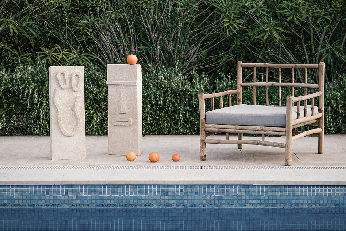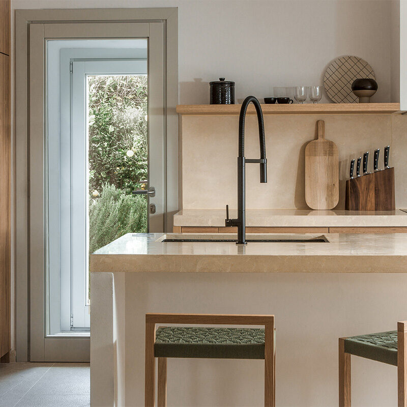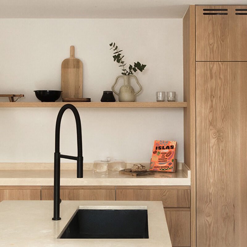 The project also drew heavily on Mallorca based designers and artists to ensure interiors have a connection to the island, too. Dark concrete sinks with terrazzo chips, natural wood kitchen cabinets and stone counter tops were custom-made by local artisans, while much of the furnishings were sourced from island-based studios such as Contain and Jaia.