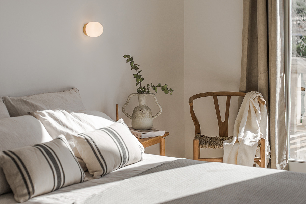 More modern aspects include microcement floors in all the bathrooms, creating a cool counterpoint to the warmer, more homely elements. Designer light fixtures throughout also add dashes of chic contemporary, with lighting by top brands like Cestita, Miguel Milá, and Menu Space.