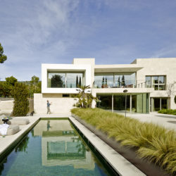 The cream-coloured limestone stone dominates the bright corridors, occasionally lined with gently curving oak slat walls that defy the otherwise uniformity of right angles found through most of the house. Transparent walls of glass connect inside spaces, including a shimmering mosaic-lined pool, while also providing an abundance of natural light and views out to the surrounding gardens from multiple vantages.