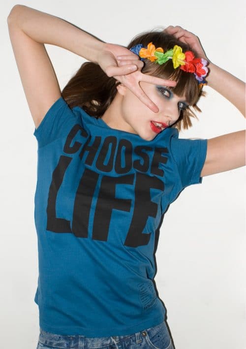 Pop bands like Duran Duran and Wham! adopted our slogan T-shirts. The techno group Frankie Goes To Hollywood was the first to copy our T-shirts. My 80s fashion campaigns were the first for Kate Moss, Claudia Schiffer, Nadia Auermaan and many others. I’ve worked with the Environmental Justice Foundation, Pesticide Action Network, and African anti-gun organizations. Celebrities wearing your clothes attract tons of attention. Models like Naomi Campbell have appeared in our T-shirts bearing slogans like, “USE A CONDOM” and “PEACE” and Jodie Kidd was in a photo wearing a “STOP WAR BLAIR OUT” T-shirt which was exhibited at the Imperial War Museum.