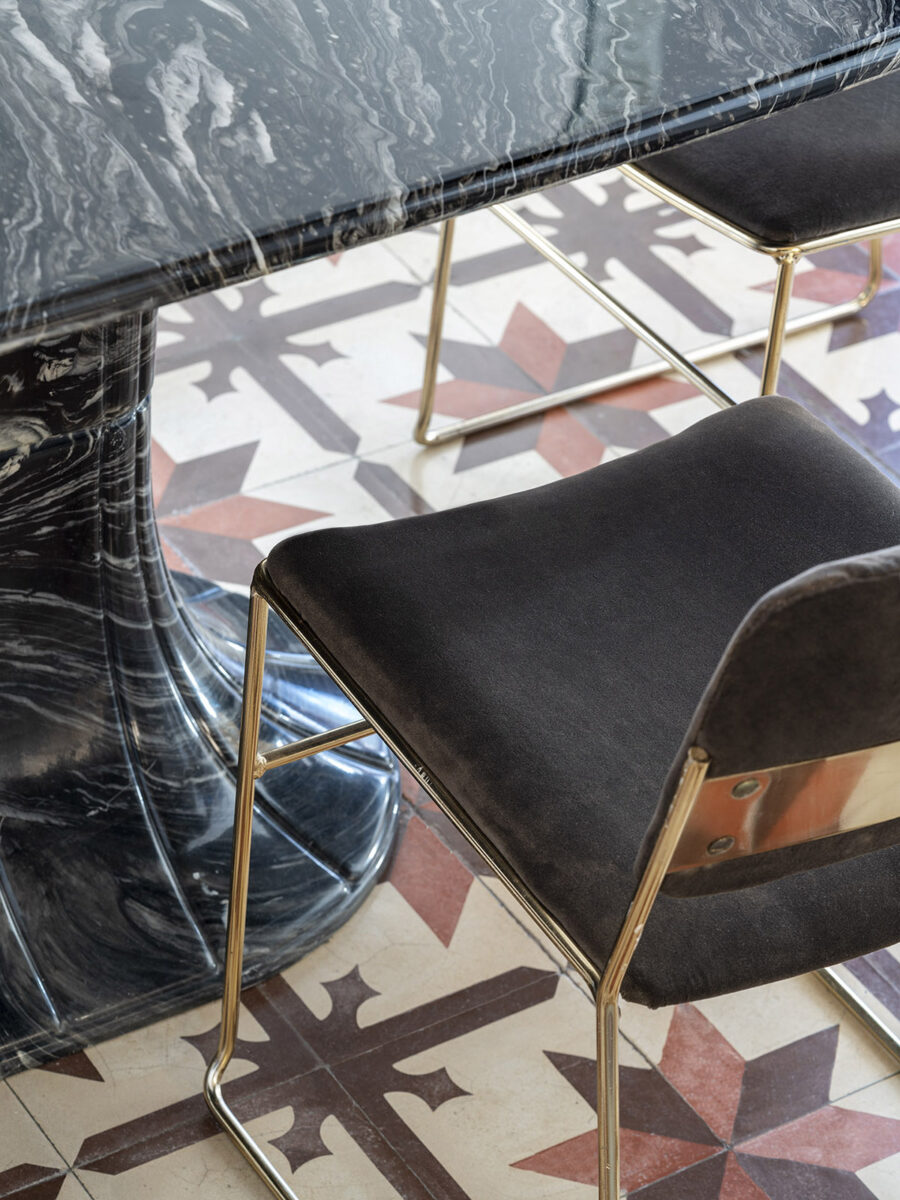 Ornate doors were repurposed as wardrobes, coving was recovered and reused, original tiling was retained wherever possible, and much of the marés stone walls were left exposed. Against the backdrop of this light-filled newly opened space, Viennese Art Nouveau was the main reference point for interior design. To this was added a varied pick of furnishings that would include retro French and Italian seating, antique cut-glass chandeliers, and mid-century Scandinavian touches.