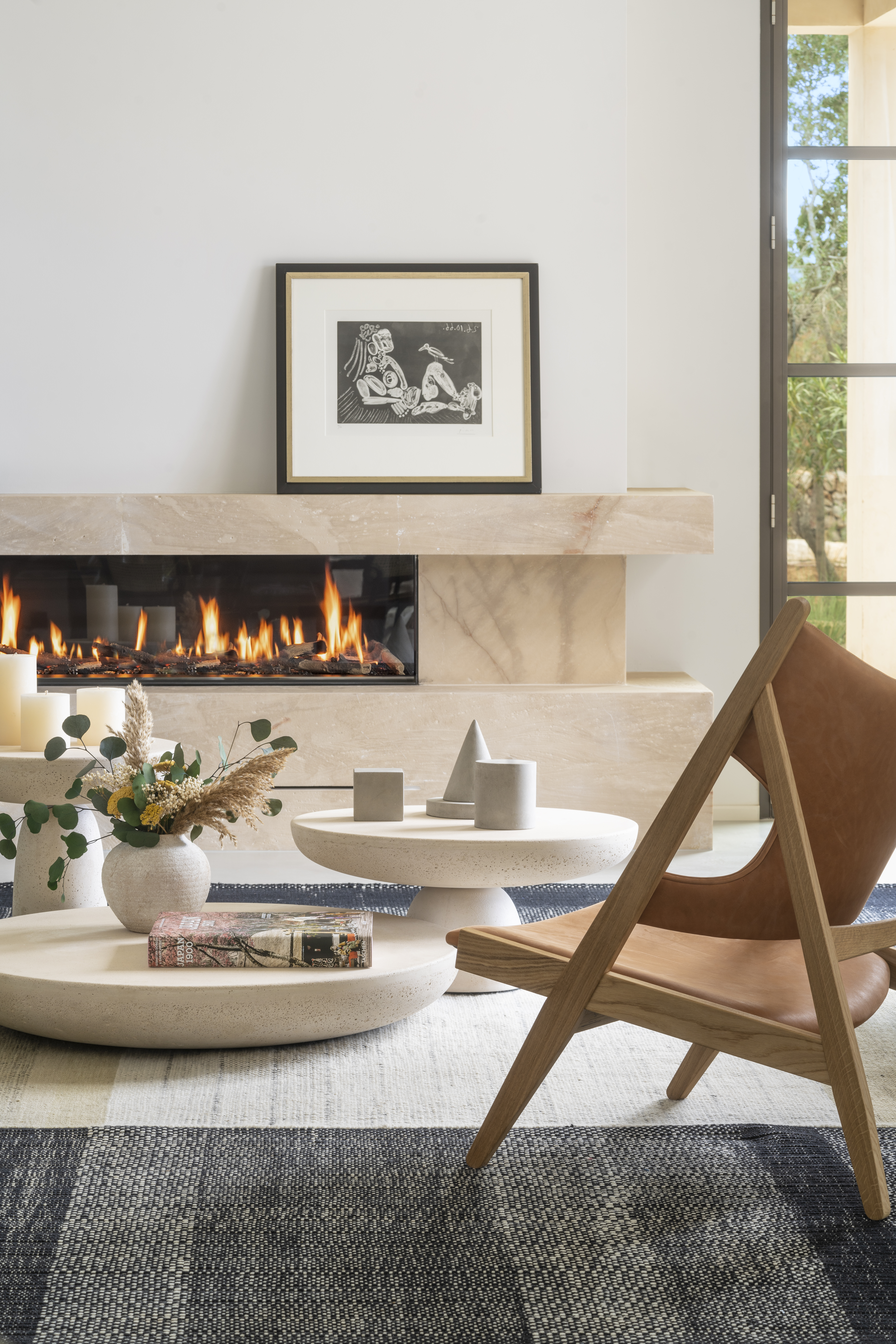 The fireplace was completely redesigned, creating an elegant and striking shape out of Santanyí stone, which adds modernity and tradition to a completely minimalist space.