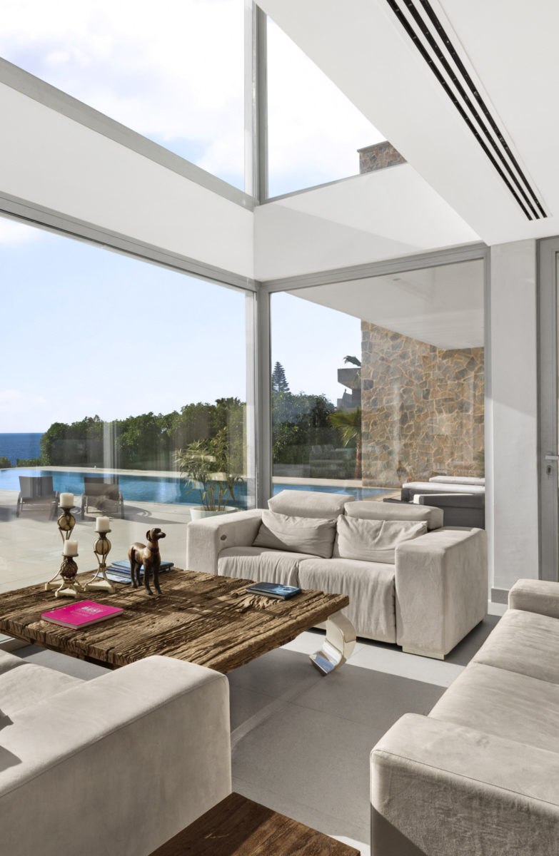 One of Antònia’s main aims was that she didn’t want it to look and feel too cold. The two main walls at the entrance and pool, therefore, are in natural stone to balance the swathes of glass and crisp Mediterranean whites. “It was designed as a home for human beings, and not a simple white-and-glass box, but somewhere to live,” Antònia explains.