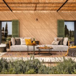 Late afternoon, and a high sun beats down on the valley and the house. Sliding doors open out from a gracious living area onto the shaded patio where a young boy and his mother lounge on dove-grey Moltenii sofas; available exclusively at Espacio, the Italian outdoor furniture looks impossibly elegant. Both take dips in the refreshing aquamarine water of a pool; retreating now and then into the wonderfully air-conditioned interior to cool their skin. A gentle mountain breeze stirs the scent of lavender. When the heat, little by little, starts to relent, it’s time to go inside and linger in the kitchen designed by Cocinart, the heart of the home. A basket is placed on a pristine counter, the boy delighting in placing treasure inside. Here, surrounded by smooth oak and quartzite, plus a host of cutting-edge appliances, the only trace of what once was is a stone urn filled with calla lilies, and ceramic bowls, overflowing with lemons.