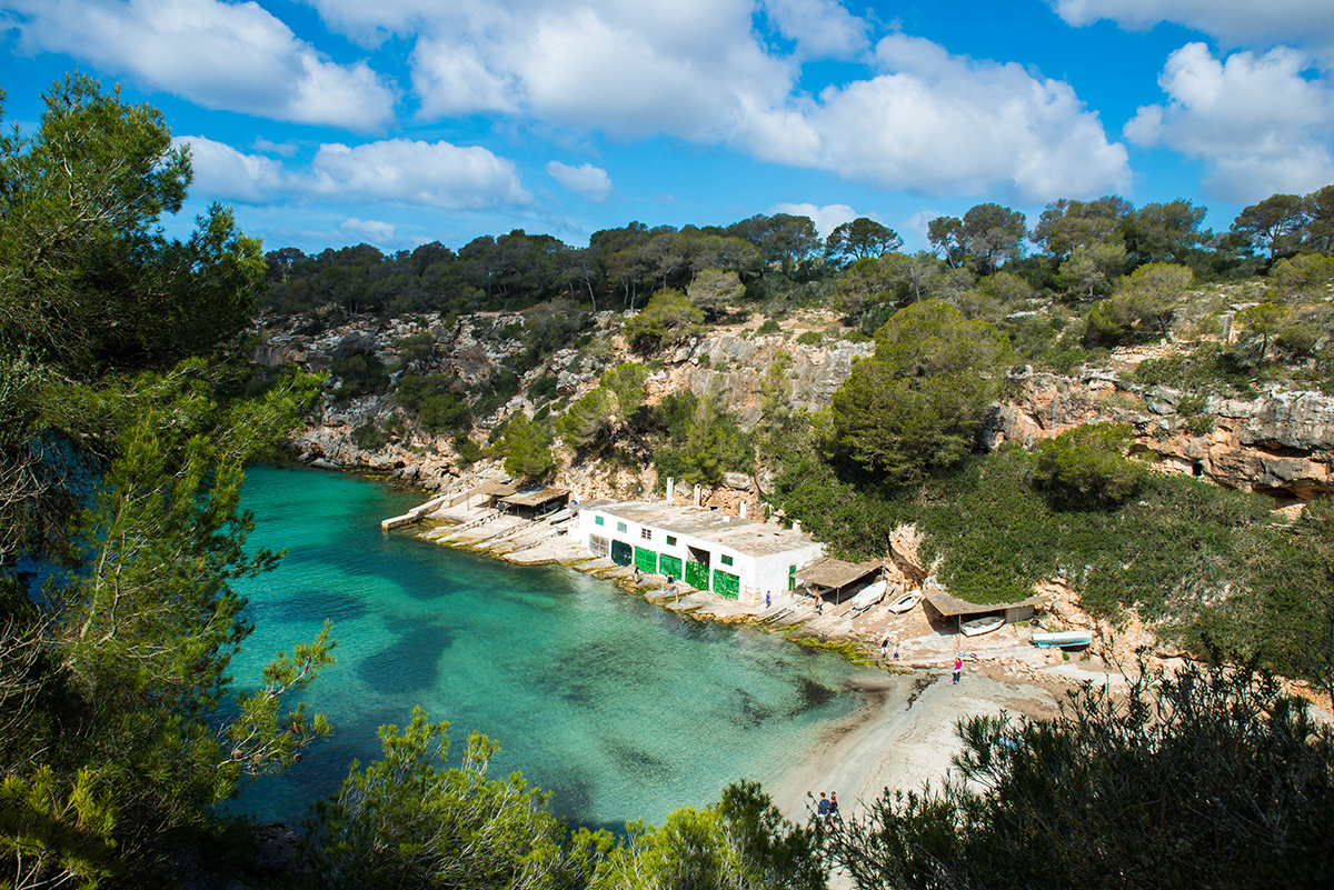 Rugged cliffs frame this narrow cove west of Cala Pi in the municipality of Llucmajor. Due to its long winding mouth it has often been compared to a river rather than a bay. It’s not a place for sunbathing but somewhere to contemplate the transparent water and to listen to the waves lapping against the boulders. Pine trees along the headland add to the sense of seclusion. Access is via a path beyond the fishermen’s huts to the rear of Cala Pi and then down some steep steps carved into the rock. Some prefer to visit by boat or kayak.