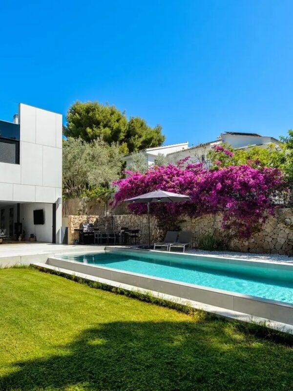 Modern four-bedroom villa with pool and garden in Cala Vinyes, offering elegant interiors, a generous plot, and tranquil Mediterranean living.