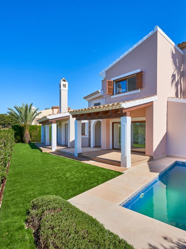 Modern three-bedroom villa in Santa Ponsa overlooking the golf course, featuring private and communal pools, sunlit interiors, and a calm Mediterranean ambience.