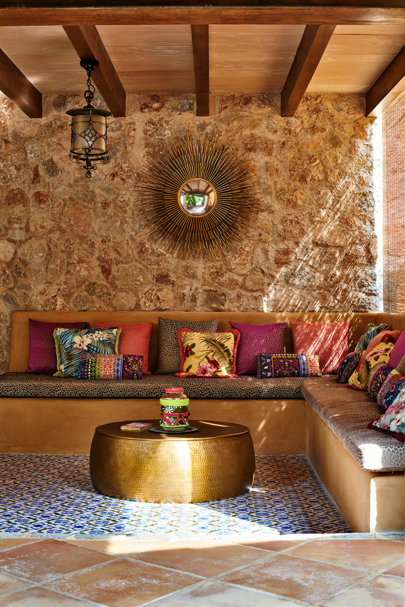Impulsively, Williams bought a falling down house in Deià. After 20 years in the fashion business, the self-proclaimed workaholic was tired. He longed for a “slower pace” and he and his partner, Joseph, had a newborn baby girl. It was the right time to make a life change. He was also beginning to transition into interiors and he has reinvented his prints into a home collection of furnishings, wallpaper and textiles. His palette and prints are perfect for the Mad Hatter eccentric interiors the English love.