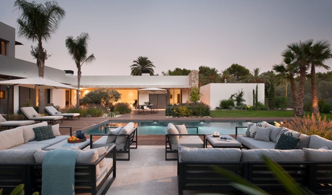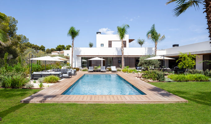 This tranquil 5-bedroom villa is located in tranquil area of Sol de Mallorca in the southwest of Mallorca (just 30-minutes away from Palma). It has a very sweet Mediterranean garden, marrying calm with contemporary elements. Circled by trees and vegetation, this is the perfect home to unwind and relax in.