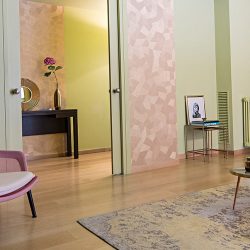 Each room has been given its own style, none resembling the last and each concealing a surprise. “Eclectic,” as she puts it. Nature acts as the main motif and the colours – gold and pink are also frequently used alongside the green – harmonise with each other despite being an unusual combination for a living space.