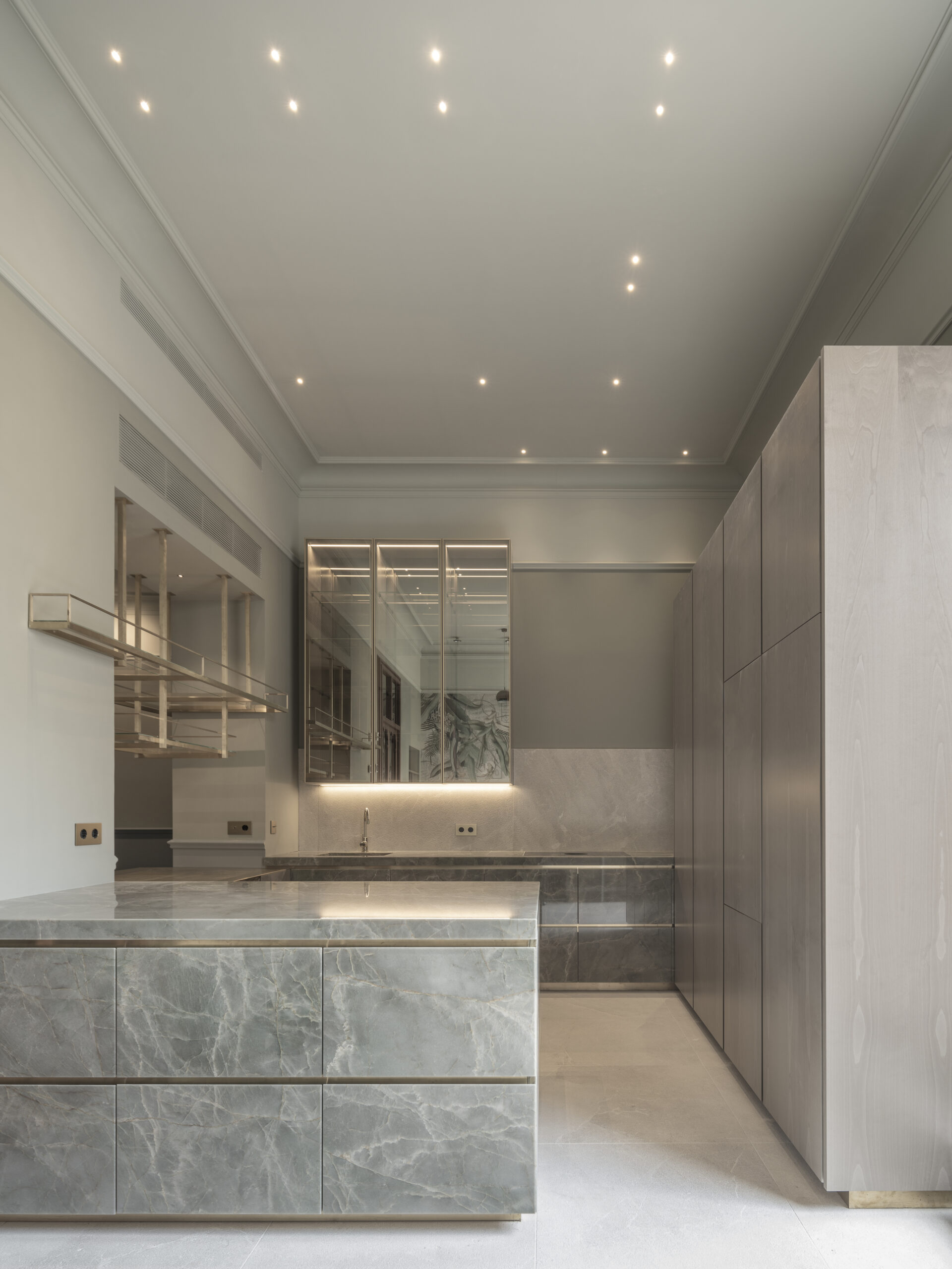 The ground floor of the building uncovered the remains of an old pottery store where innumerable clay items were recovered and donated to charity. Now, an indoor pool takes pride of place in the restored warehouse space. The original façade of the building had a prominent greenhouse conservatory, and so a carpenter-craftsman was enlisted to reproduce the feature, emulating the vintage design. Even before the new owners have put their stamp on the property with furniture, it’s clear that even an empty Alibaz property can convey sophisticated classic style in every corner.