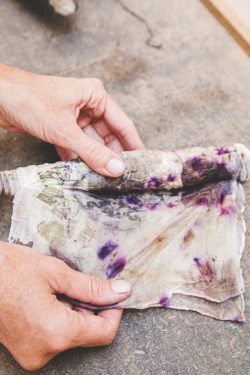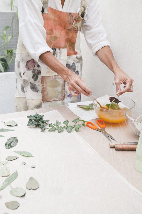 This is also reflected in Tatiana’s own body of work, which is focused on natural dyes on different surfaces from paper to silk to yarn. Three years ago, she took a natural dye workshop and immediately connected with it. This was followed by a workshop in eco-printing, in which flowers or plants are laid on the surface before pressing. At the shop she has a selection of avocado-dyed scarves that are the softest pink, and gorgeous, multi-coloured yarn dyed from such ingredients as black olives and turmeric.