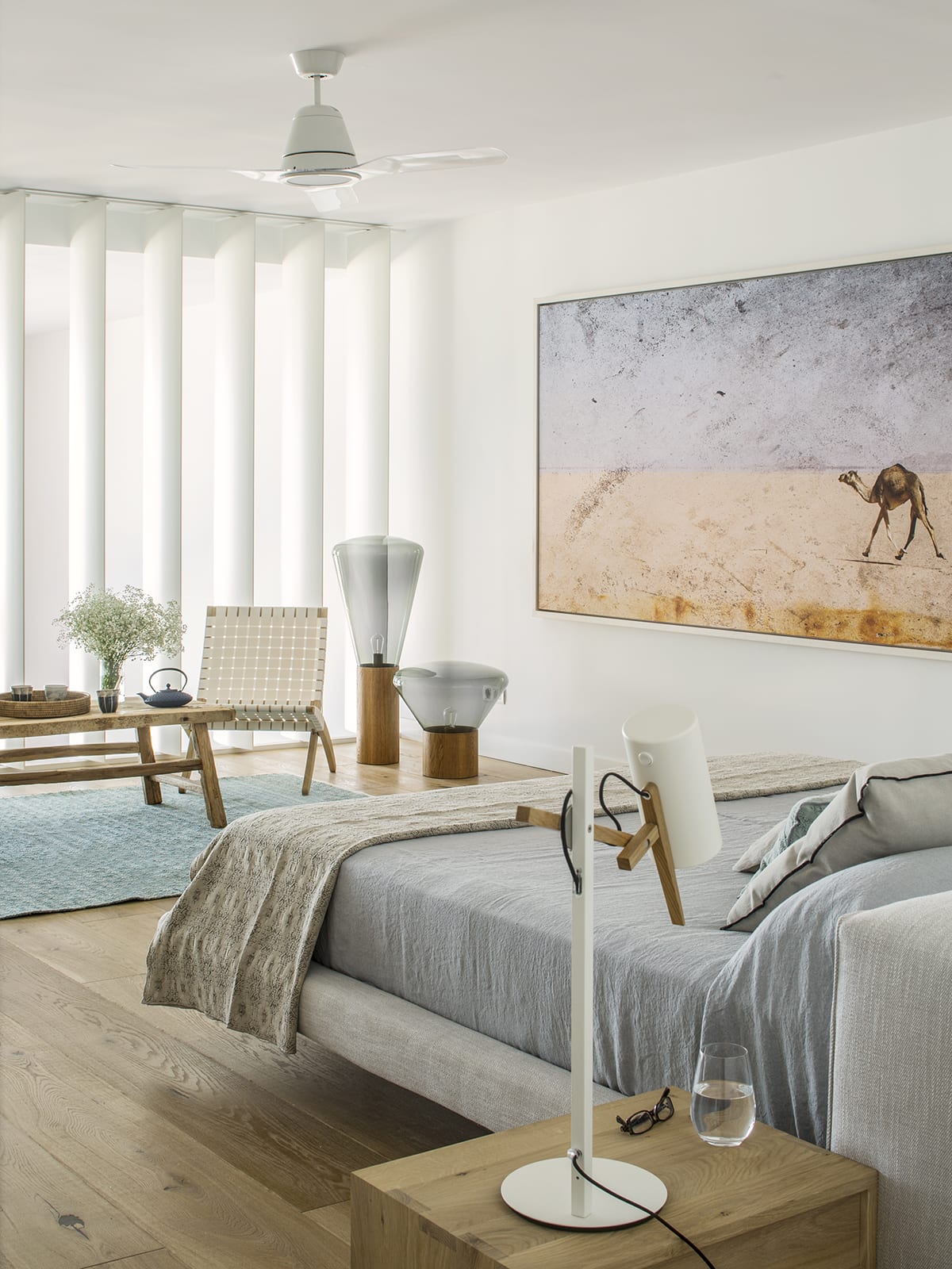 In the family room we designed a sofa that covers a large irregular area and took advantage of its back to design and create a piece of furniture that would integrate the pillars and dress the house’s entrance. Rounding out the space is a set of tables, a natural rug, an integrated TV cabinet and a good collection of textiles and decorative items.