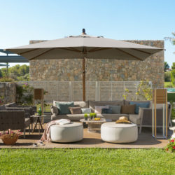 Outside, a platform was created for the lounge, which is integrated into the surrounding complex through elegant lattices that provide privacy but at the same time allow constant communication with the space.