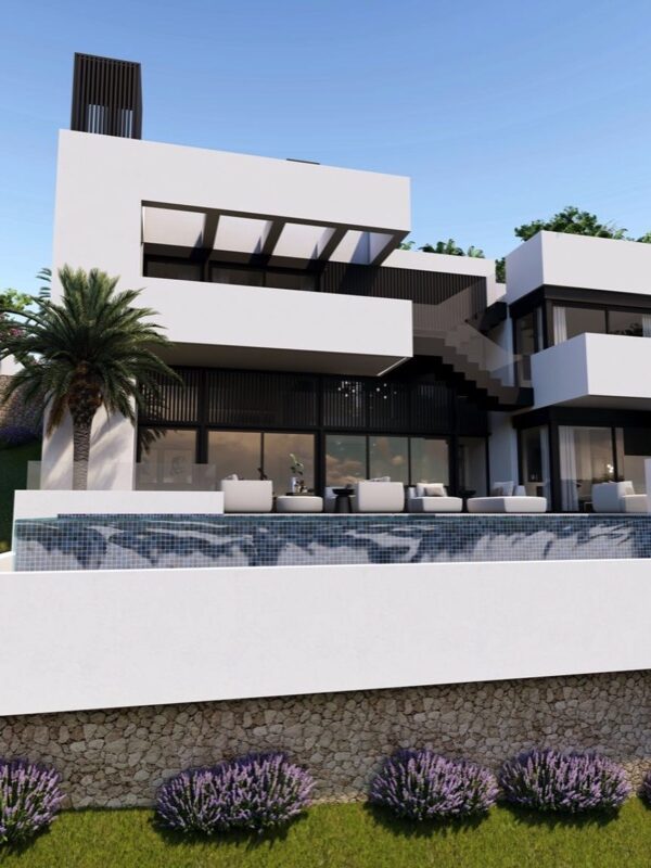 This villa originally designed for a sloping plot, is built over various levels, providing a split level feeling with high ceilings and breathtaking views. The property features a brilliant white facade and an infinity pool.