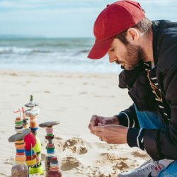Julià describes his approach to found objects as archaeological, finding bottles and lids washed up with Arabic and Tunisian origins, lighters, fishing lures, and plenty of cotton earbud sticks. In making sense of these objects, Julià uploaded images of the ritualistic sculptures of sand, shells, stones, and consumer waste that formed miniature beach altars and totems, using the hashtag #altaresytotemsplayeros when uploading them. Elements of these humble structures can be seen transformed into aspects of his artworks, taking the form of larger floor and wall sculptures, photography, video, and collage that have been exhibited at Galeria Fran Reus in Palma, Sunday Art Fair in London, and ARCO, Lisbon.