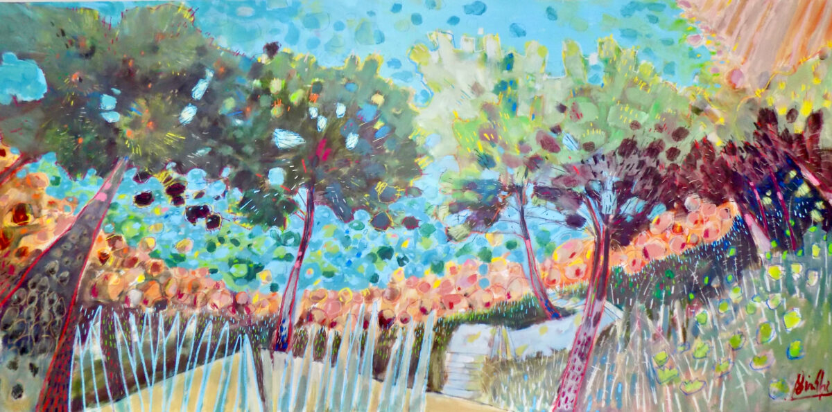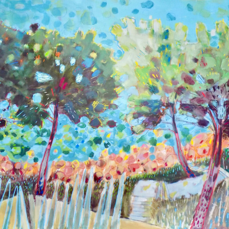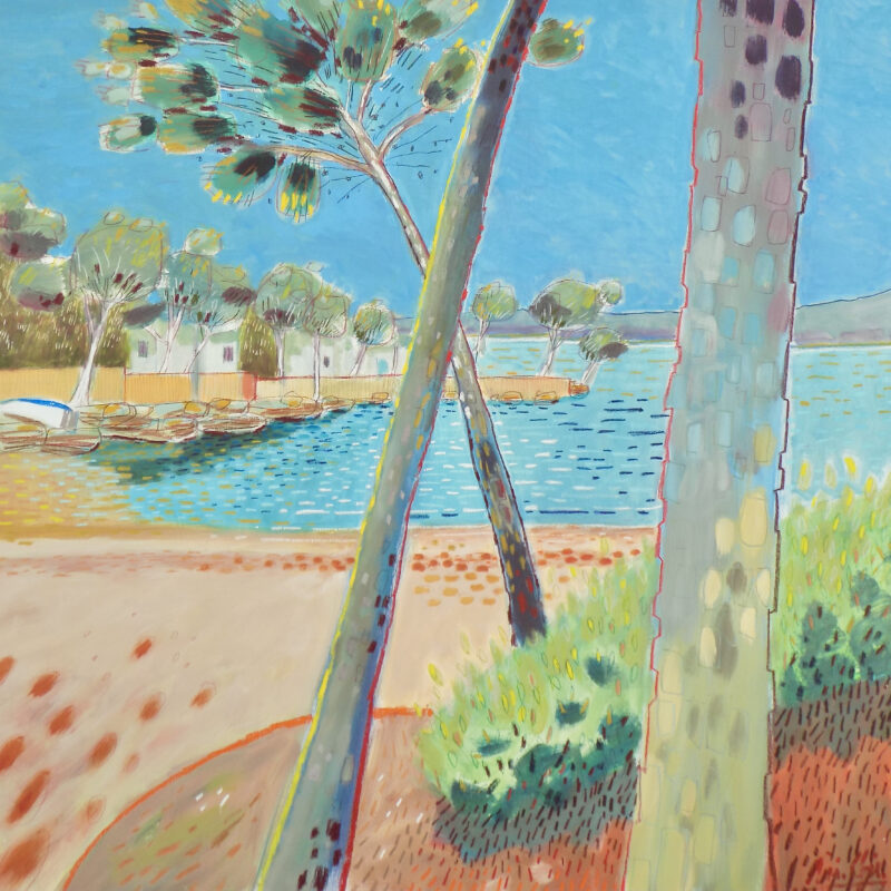 Adrian spends his time between the UK and Mallorca, and says he enjoys visiting the two different landscapes. His work aims to capture the unfinished landscape of perpetual change, with loose brush strokes, first marks and last marks, transparent overlays of nature and an uneasy balance of finished and unfinished areas of work.