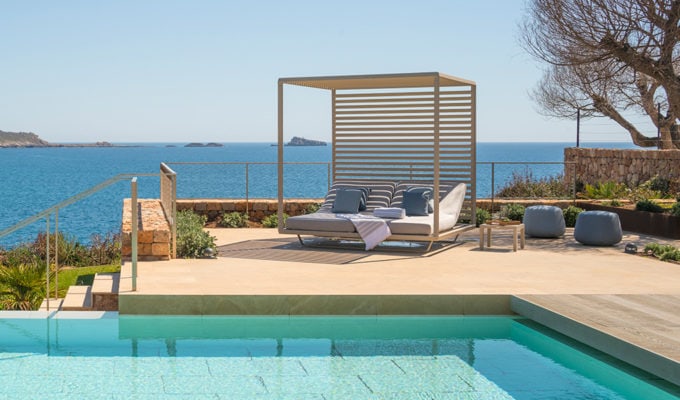 Natural light also plays an essential role in this spectacular residence. The zenia-style tiles used for the pool are designed not to interfere with the perfect reflection of the sky. The result is a soothing turquoise blue. Beyond, the breath-taking sea views complete this paradisiacal composition.