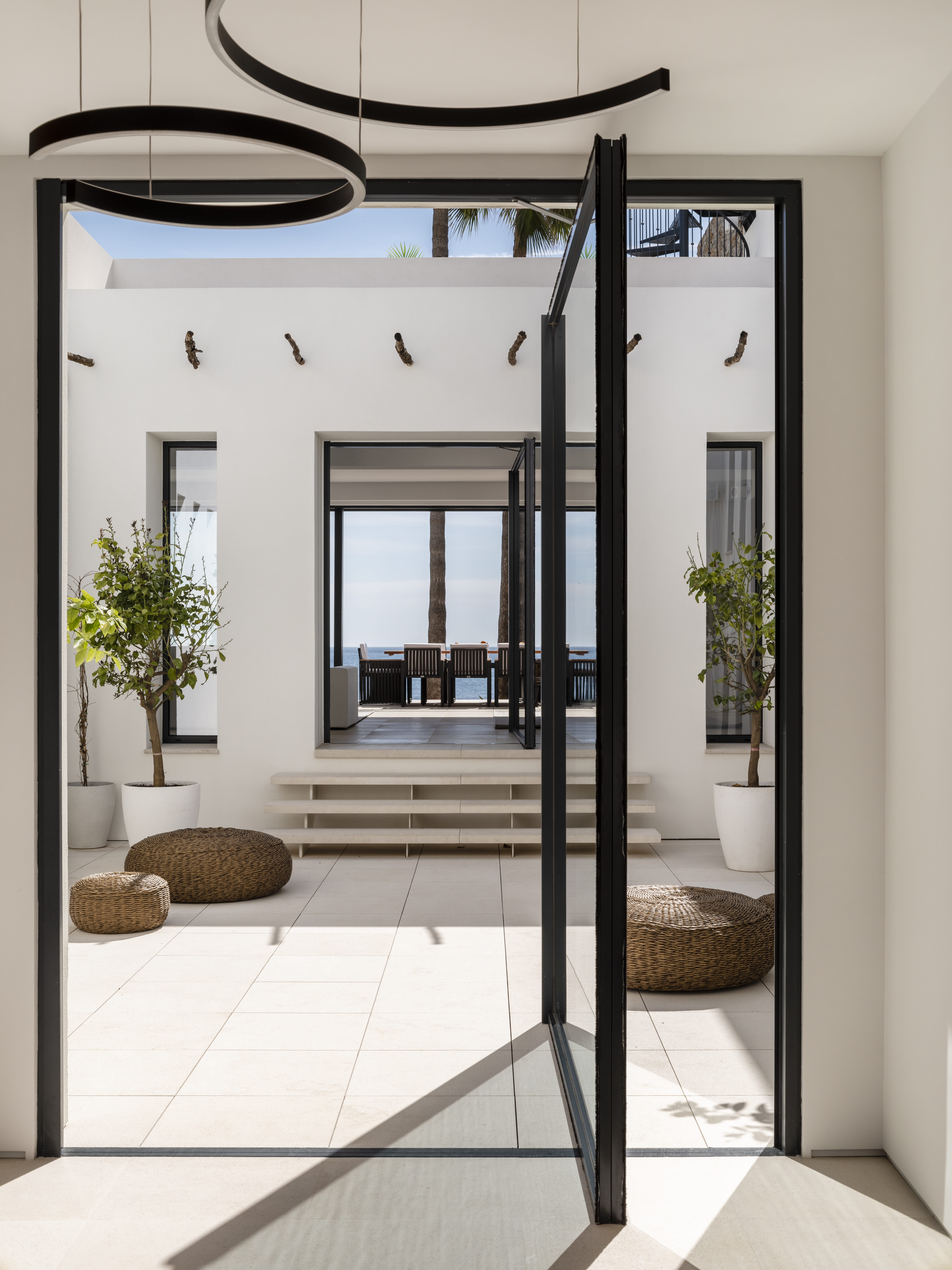 Wood, steel and stone play their part in the layering of texture and interplay of light and shadow. Meanwhile, the organic palette has been chosen for its warmth, leaving the hues of the sky and sea to stand out. The coast is integrated so perfectly that from the bedroom, the feeling is of being on the deck of a luxury yacht. There is no sand to be seen, just endless blue sea.
