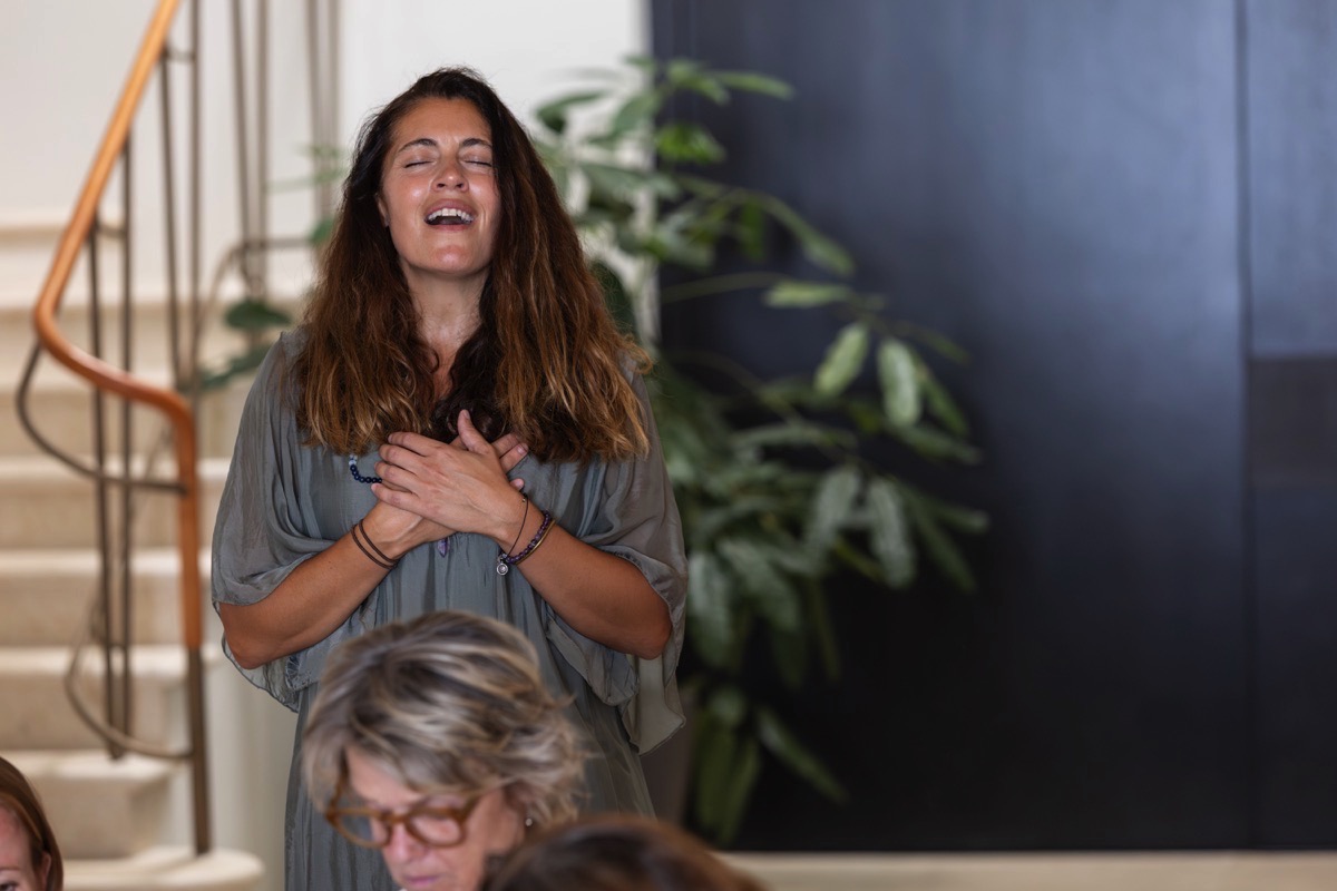 Next on the agenda for the enchanting evening was a beautiful Kirtan (Mantra and Prayer singing) performed by Tefi Skoufalos and Stephan Becker on the piano. Their Kirtan created a special atmosphere, like a deep meditation that brought the group together even more. Afterwards, a delicious dinner was shared in the evening’s summer air.