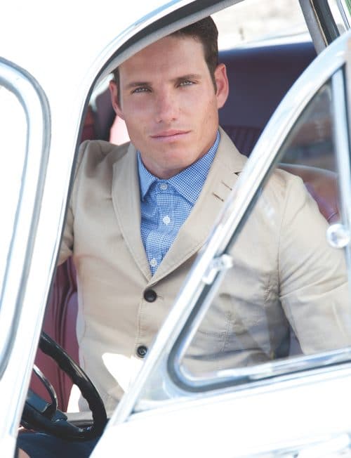 Being a summer and seaside theme, blue and white were prominently used though floral and square patterns were also to the fore. As has been the fashion this year, Javier’s tops and shirts were buttoned up to the top.