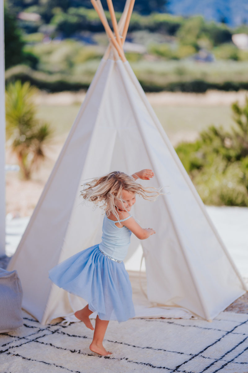We’re lucky Tatiana can meet us. The Belgian self-taught seamstress has a very important party to plan. The theme is complex. The client has big ideas. Tatiana counts them off on her fingers, “Princess, Frozen, Rapunzel, Unicorns… oh and rainbows!” The party is for her (nearly) four year old daughter, who has witnessed her mother’s creations come to life at their home in Alaró.