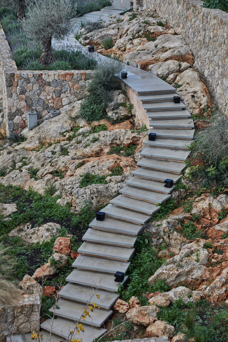 Wooden shutters let in the breeze and, at the same time, filter the daylight. This creates a living, dynamic house that can change and adapt to every season and climate. For the façade, they used up-lights so that both the stone walls and the wood are warmly bathed in illumination and natural textures are emphasised.