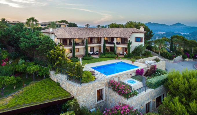 The plot covers a generous 1,325 square metres and the building is spread over three floors; ground level features a garden with a raised swimming pool while a decked rooftop terrace provides panoramic vistas over the picturesque surrounding hilltops and Cala Llamp bay. The villa’s location and bearing also makes for enjoying some wonderful sunsets. The property also comprises a total of five bedrooms, gym/sauna, office space, and enough parking for six vehicles (four inside and two out), plus house guests can have use of a separate apartment.